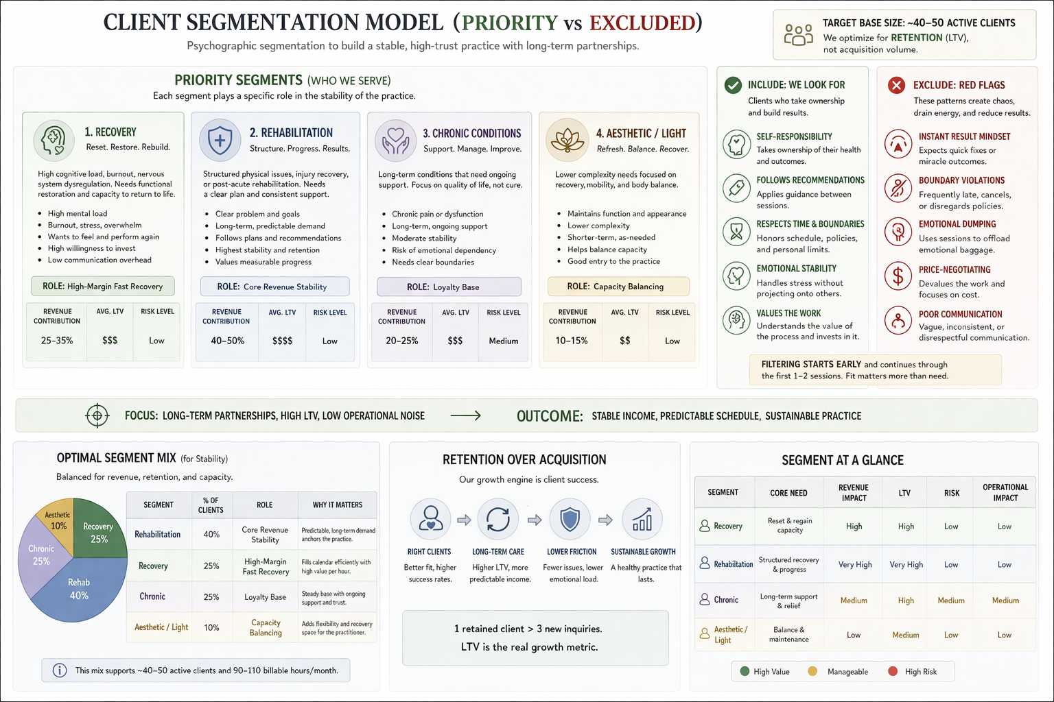 At the core of the system is client architecture. Instead of treating all incoming demand equally, the system segments clients based on behavior, values, and relationship model. This allows the practice to prioritize high-value, low-friction clients and deliberately limit segments that create operational instability.