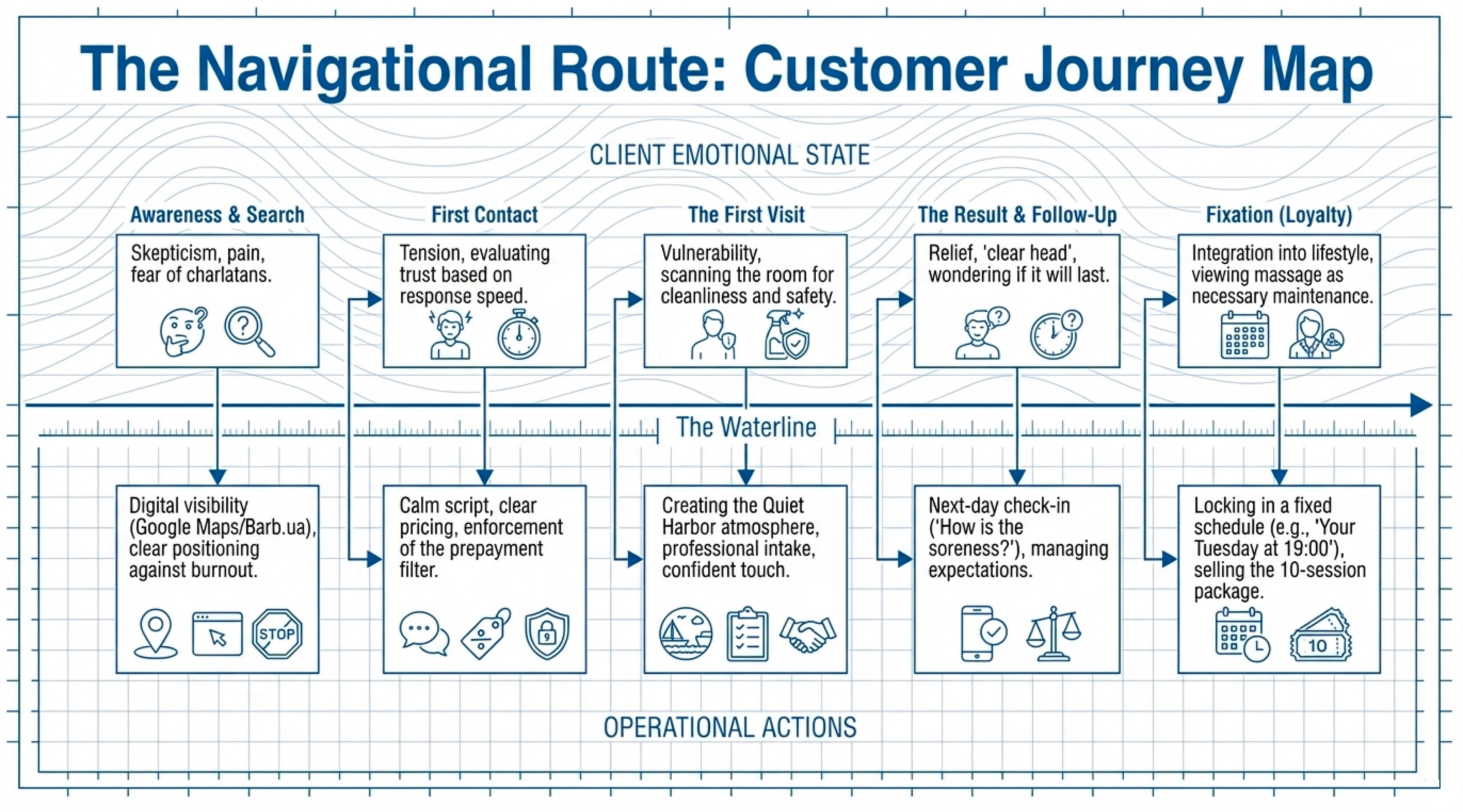 The customer journey was structured to support filtering, trust-building, and retention. Each stage from awareness to repeat visits was designed to reinforce the positioning and remove incompatible clients early.