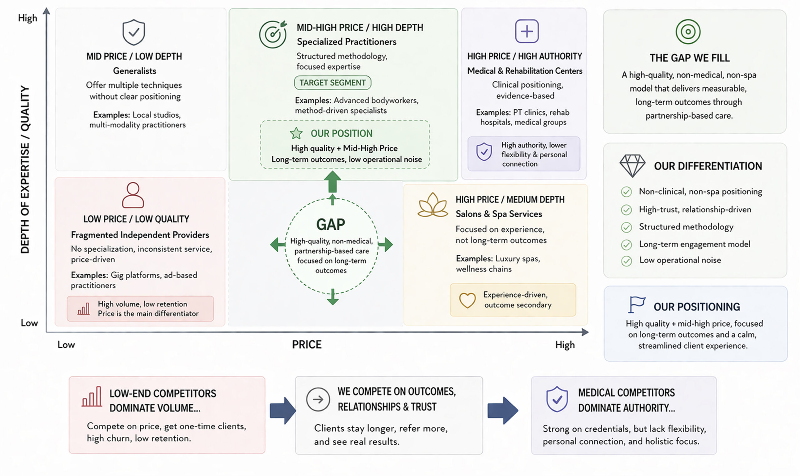 The third segment is represented by higher-priced providers, including wellness studios and rehabilitation-oriented specialists. These competitors rely on perceived expertise or environment, but in most cases still operate without explicit client models, capacity constraints, or defined operational logic.