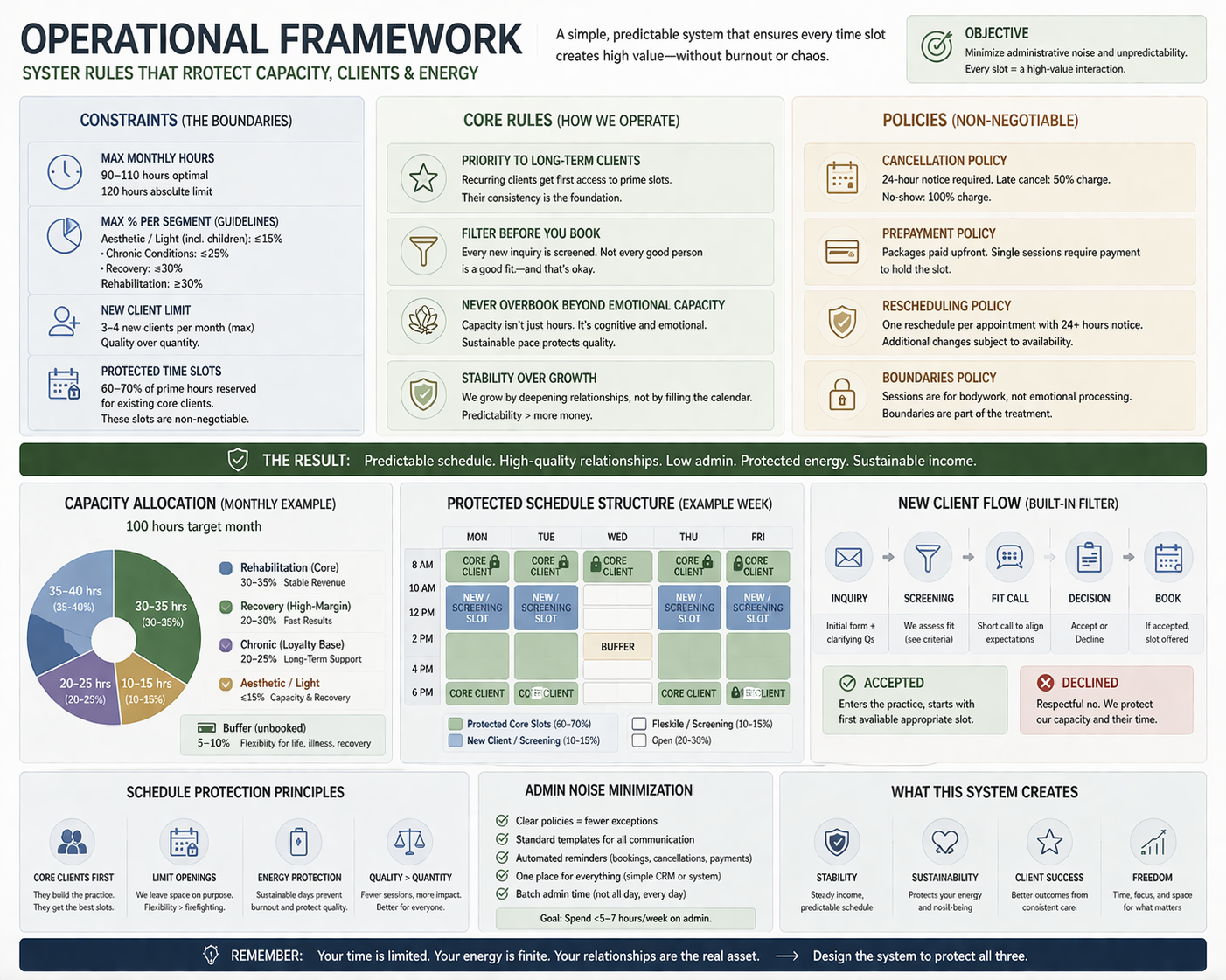 I designed the practice as a product system where capacity, client type, and operational rules are explicitly defined and controlled.